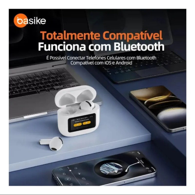 Fone De Ouvido Bluetooth Sem Fio Tws In-ear Tela Touch Lcd Cor Branco Basike 6697